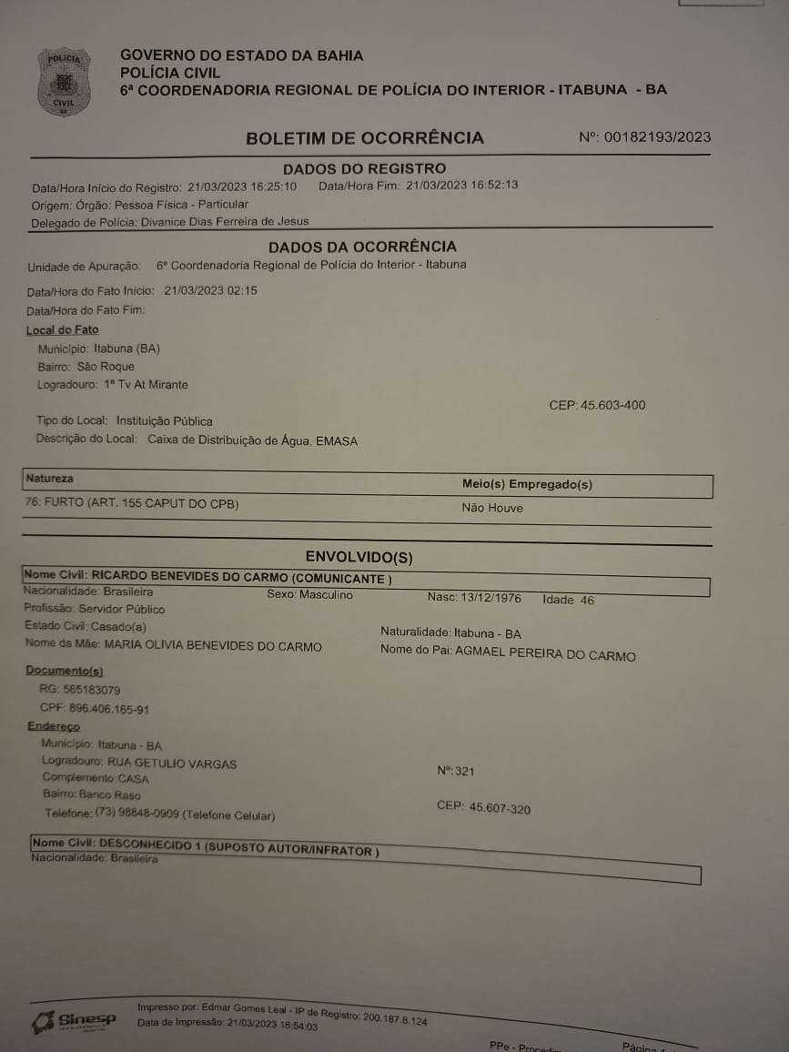 Além disso, houve o registro de um Boletim de Ocorrência (BO) número 182.193/2023, junto à Delegacia de Furtos e Roubos da 6ª Coorpin da Polícia Civil da Bahia.