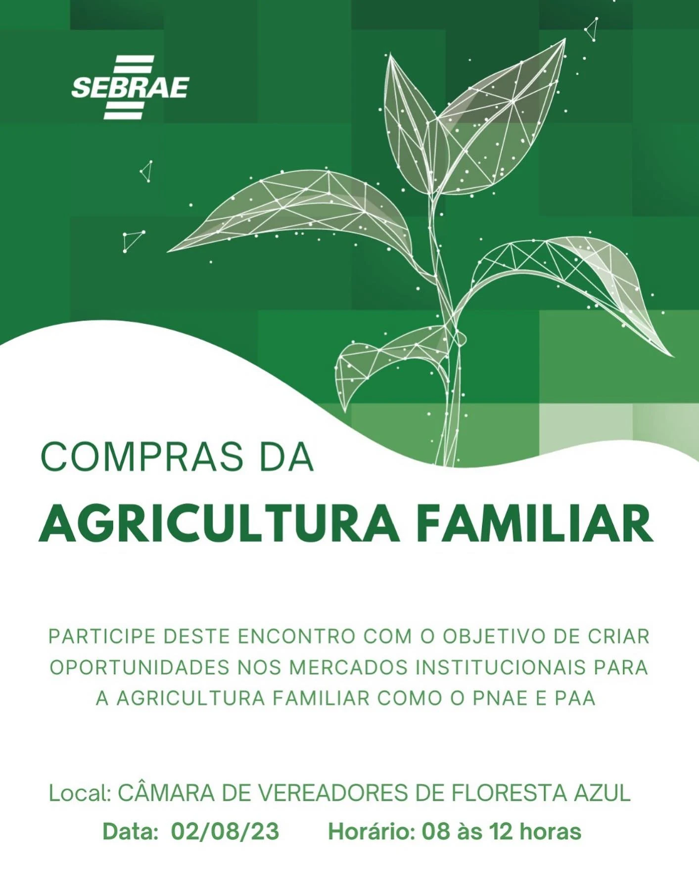 A prefeitura de Floresta Azul tem o prazer de convidar a todos os cidadãos para participarem da Primeira Reunião Presencial da trilha de Compras públicas para agricultura familiar. Essa importante reunião acontecerá no dia 02/08/2023, às 08 horas, na Câmara de Vereadores.Nesse encontro, teremos a oportunidade de discutir e debater estratégias para fortalecer a a6gricultura familiar em nosso município.