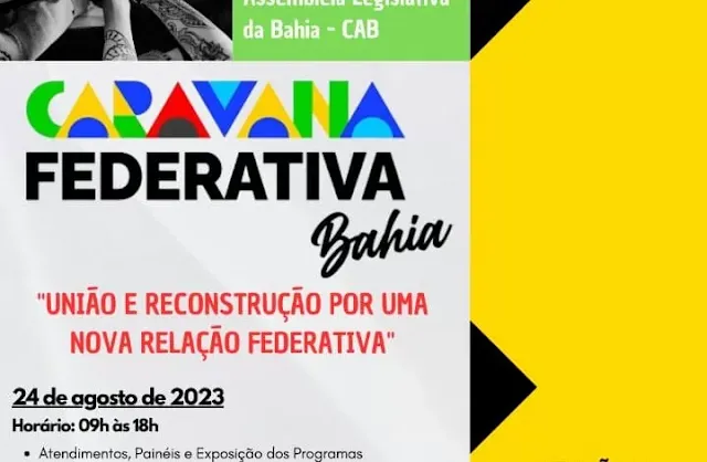 Realizada pelo Governo Federal, a Caravana Federativa elegeu a Bahia para dar a largada e ser o primeiro estado a sediar a iniciativa que levará atendimento aos gestores municipais em todo o Brasil. O evento será realizado nestas quinta e sexta-feira (24 e 25 de agosto), das 9h às 18h, em espaço montado na área verde da Assembleia Legislativa, no Centro Administrativo, em Salvador. A expectativa é receber cerca de 250 prefeitos e representantes de prefeituras baianas.