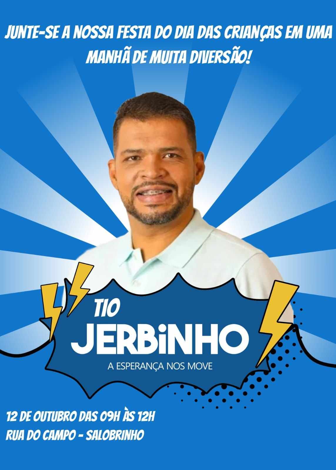 No dia 12 de outubro - dia das crianças - acontecerá no Salobrinho (Rua do Campo), uma festa com muita alegria e diversão. Das 9h as 12h, contaremos com participa de personagens: HULK, HOMEM ARANHA e SONIC!!Além do sorteio de 1 Bicicleta, Brindes e muito mais! O tio Jerbinho conta com a presença de todas as crianças para essa comemoração.