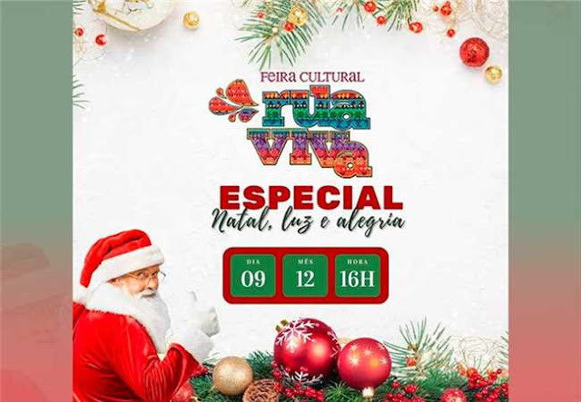 A Feira Cultural Rua Viva realiza, no próximo sábado (09), a “Edição de Natal”, uma feira especial, que reúne arte, música, a presença do Papai Noel e, como todos já estão acostumados, os artesãos e representantes da economia criativa ilheense que sempre marca presença e abrilhanta as edições da ‘Rua Viva’.