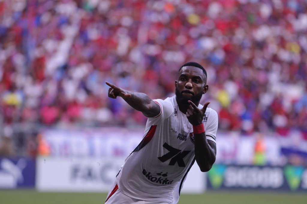 Em jogada ensaiada na cobrança de falta, Everton Ribeiro rola curto para Sanabria. O atacante domina e solta um chute com muito veneno, buscando o ângulo. Lucas Arcanjo voa nela e opera um milagre para salvar o Vitória aos 30 minutos!