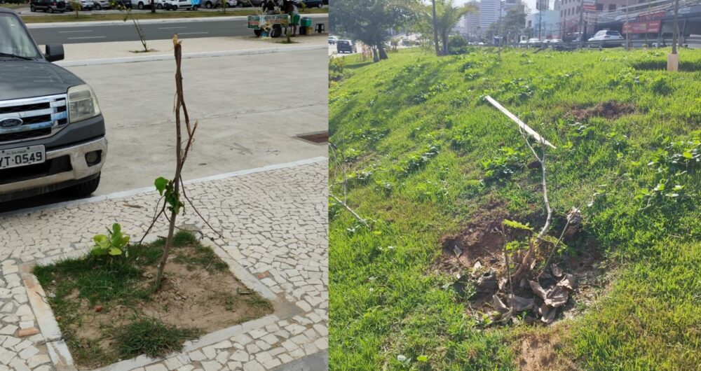 Entre as práticas mais recorrentes que têm reduzido a efetividade dos plantios realizados em diversos pontos da capital baiana, estão danos aos sistemas de irrigação, corte de mudas e furto de tutores (estruturas utilizadas para oferecer suporte e estabilidade a plantas em crescimento).